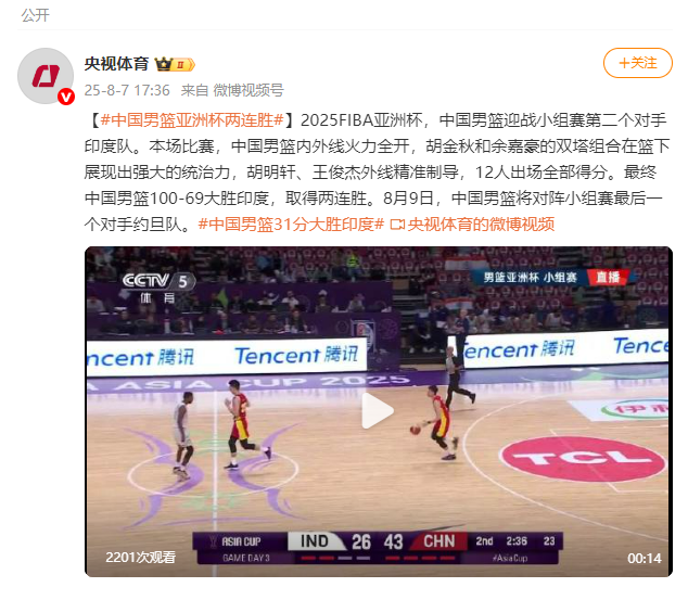 根据@CCTV Sports的说法,亚洲FIBA 2025的亚洲杯将看到中国男篮球队在印度团体阶段面临第二个对手。在这场比赛中,中国男性篮球队在内外完全被解雇。胡金(Hu Jinqiu)和Yu Jiahao的两个塔楼的结合在篮筐下表现出强烈的统治。 Hu Mingxuan和Wang Junjie准确地指导了外部,并在12名球员出现时赢得了一切。最后,中国男篮球队以100-69击败印度,连续两次取得胜利。 8月9日,中国男性篮球队将在小组赛中面对约旦的最后对手。编辑Mao Tianyu