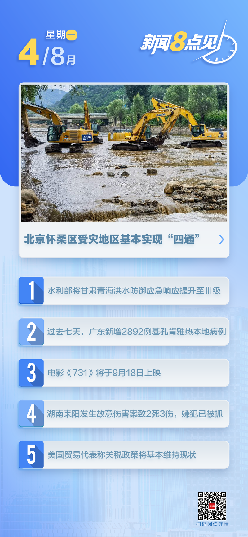 [目前的问题]水资源部改善了第三级对甘辛的防御洪水的紧急响应。根据“水资源水资源部的紧急响应法规”,水资源部改善了8月3日在两个州的8:00在IV级的甘斯和Qingda洪水防御的紧急响应。这部电影由Zhao Linshan导演,并由日本的抗雄性暴露于中国,并通过平民的角度侵害了中国。 (新华社新闻社)在过去的七天中,广州从2025年7月27日至2025年8月2日增加了2,892例奇肯亚发烧案件,并在2892年获得了当地的基孔肯尼亚发烧案件,已在广东省获悉,严重或死亡。这些案件在Foshan,65,65岁的广州,65岁,在Dongguan和Zhongshan,深圳,江门和Zhaoqing的6,在朱豪和霍伊岛的5,在Chaozhou的2,在Yangjiang和Yunfu中为1。 CCTV新闻)阅读完整文本>>> [本地]在Huairou区影响灾难的地区基本上实现了“四个联系”。 8月3日,一位记者得知北京的Huairou区,受Huairou区影响的村庄基本上实现了“四个联系”。 Huairou区发布的数据表明,初步统计数据表明,Huairou区的洪水灾难有198个村庄(包括自然村庄),灾难影响了约100,000人。 (北京新闻)阅读完整的故事>>>北京男子篮球运动员Zeng Fanbo将在北京布鲁克林网队与球员Zeng Fanbo进行良好沟通后,将签下NBA Brooklyn Net球队并达成了共识。目前,北京的男篮球运动员Zeng Fanbo将与Dand NBA Brooklyn Nets队签约,并将飞往美国参加测试训练比赛和训练营,并将参加他们的梦想。 (北京Showgan篮子所有俱乐部)阅读全文>>>在中国超级联赛的第19轮中,北京,阿戈斯托洛3,我在家中与天津·金门老虎队一起以2-2的速度和2-2在1925年中国中国资源的第19轮中与天津·金门·蒂格斯(Tianjin Jinmen Tigers)一起以2025年中国超级联赛的2025、2-2-2-2-2-2-2和2-2和2-2和2-2和2-2的比分。 (北京GUA ANN足球俱乐部)阅读全文>>> [社交]在广州武田的一栋住宅大楼中爆发了一场大火,这导致五人死亡。官员:消防点在8月3日的8:30在一楼,在市政府城市朗库纳(Longcuna)地区的一栋住宅建筑中爆发了一场大火,炸死了五人。 8月3日下午,一名北京新闻记者了解到,PA紧急管理人员将大火在住宅建筑的一楼。目前正在发生火灾,后遗症和大火的原因正在调查中。 (北京新闻)阅读全文>>>五个人是En在广东省的西迪安·霍芬发现,没有生命体征。 8月3日,广东省Huidong县的Huidong县应急管理办公室发布了一份状态报告。据报道,2025年8月1日,据报道,有110名警察去了Huidong县Bai Bantu县的Baima Shan。在比赛中,他们用水洗去,接触失去。在8月3日的14:15左右,发现了五个,找不到生命体征。 (CCTV新闻)阅读完整的故事>>>在湖南发生的Leiyang,有两人死亡和三名伤口。一名31岁的男子被警察逮捕(Reiyan公共安全),洪水重复的口齿失去了与中国公民的接触。澳大利亚新南威尔士州的许多地方最近陷入了大雨,导致突然洪水。悉尼的中国将军领事馆第三证实,第二天晚上,一个中国公民被一座快速山拖了,失去了接触。 (XinhUA新闻社)阅读全文>>> [财务]从晚上9:28开始。 8月3日,2025年夏季电影(6月至8月)的票房总收入超过70亿。 “ Nanjing Photo Studio”,“ Chang An’s Lychee”和“侏罗纪世界:重生”被暂时归类为当时的三个最佳办公室。 (接口新闻)[体育和体育]世界水生锦标赛:美国队重新注册了世界纪录。中国队赢得了两个白银和两个青铜。世界新加坡T冠军的游泳比赛排名第三。同一天举行了八项决赛。美国队打破了世界纪录。中国队增加了两个银和两个青铜,最后以两枚金,六个银和六个青铜色结尾,并以女性游泳者的表现出色。 (新华社)阅读全文>>> [国际]美国商业代表说,海关政策实质上维持现状。 8月3日,美国商业代表格里尔(Greer)表示,上周美国总统在许多国家征收的新关税已“基本上确定”,征收了从加拿大进口商品的35%的关税,巴西的50%和25%的印度税率和39%的关税。 (CCTV新闻)乌克兰总统:与俄罗斯达成共识,以交换1200名战俘。 8月3日,总统乌克拉尼亚纳·泽伦斯基(Ucraniiana Zelensky)在社交网络上说,他已经与乌克兰国家安全和国防委员会负责人乌梅罗夫(Umerov)和乌马克(Umerov)和Yamak讨论了谈判进程。讨论涵盖了在伊斯坦布尔的对话和准备期间与俄罗斯达成的协议的实施,以准备新的对话。 Zelensky说,囚犯的交换是目前取得积极进展的关键问题之一。双方都达成了交换1200名战俘的协议目前正在计划交流列表。 (CCTV新闻)阅读完整的故事>>>在也门水域推翻的非洲移民船导致54人死亡,缺少数十人。 (新华社)阅读全文>>>编辑Jia Congcong Sun Linzhi测试评论Wang Xin