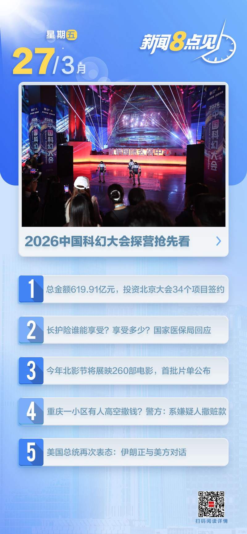 【时政】特朗普总统表示将于5月中旬访华。外交部:中美双方正在就此问题继续保持沟通。美国总统特朗普宣布将于5月中旬访华。 3月26日,外交部发言人林坚在例行记者会上回答记者提问时表示,元首外交在中美关系中发挥着不可替代的战略引领作用。中美双方就特朗普总统访华继续保持沟通。 (新华社)商务部:我们敦促日方真诚反省、改正错误,为两国正常经贸合作创造条件。 3月26日,商务部举行例行记者会,在回答有关日中经济关系问题时,商务部新闻发言人何永谦表示,中国坚持高度开放,愿与中方一道努力,推动中日经济持续健康发展。致力于打造国际化、法治化、市场化的一流营商环境。中日工商会最新调查显示,日本企业在华经营状况总体良好,对中国营商环境满意度依然较高,有望继续拓展中国市场。中日稳定健康的经贸关系符合两国人民的共同利益。我们再次敦促日方真诚反省并纠正错误,为两国正常经贸合作创造条件。 (新华社) 哪些人可以享受长期护理保险?有多有趣?国家医保部就国务院报业办新闻发布会作出回应。针对“参加长期护理保险的人可以如何获得以及获得什么样的福利?”的问题进行了回答。张喜发国家医保局福利保障司副司长n表示,人们最关心的问题是谁能领什么、能领多少、在哪里领。这也是政策设计的主要重点之一。 (人民日报客户端)阅读全文>>>相关新闻 八部门公布《加快护理保险制度建设实施方案》。第十四届全国人民代表大会第四次会议代表统一提出提案8406件。 3月26日,召开第十四届全国人民代表大会第四次会议代表提案会议。据报道,在第十四届全国人大四次会议期间,全国人大代表共提出提案8406件。全国人民代表大会常务委员会代表工作委员会全面组织召开会同相关方分析结果,送达206家业务单位,并依法落实审查处理。 (新华社)阅读全文>>十三届全国政协教科卫体委员会副主任刘辉因严重违纪违法被开除党籍。经中共中央批准,中央纪委国家监委对十三届全国政协教科卫体委员会副主任刘辉严重违纪违法案件进行审查调查。根据有关规定,经中央政法委常务委员会审议经纪律检查并报中共中央批准,决定给予刘辉先生开除党籍处分。所享受的福利将被取消。没收你的非法收入。如果你的刑事指控被移送检察机关依法审查处理,相关资产也会被移送。 (中央纪委国家监委网站)阅读全文>>>柯文哲一审被判处有期徒刑17年。台湾人民党前主席、台北市前市长柯文哲被指控非法提供土地赏金、政治献金和挪用北京花城市的社会资金。 26日下午,台北地方法院判处柯文哲有期徒刑十七年,剥夺官方特权六年。 (新华社)相关消息柯文哲被判刑入狱17年。国台办回应称,中关村北京论坛投资大会共签约619.91亿元、34个项目。作为中关村2026论坛年会的重点活动之一,2026北京投资大会于3月25日在中关村国际创新中心举行。记者在会上了解到,当地签约重大投资项目34个,总金额6199.1万元。 (新京报)阅读全文>>>相关新闻聚焦丨2026中关村论坛2026中国SF大会露营之旅预告玉渊潭公园第一朵樱花盛开。客流量将在本周末达到顶峰。玉渊潭公园首批樱花盛开。玉渊潭公园供图 记者了解到,在玉渊潭公园,随着气温持续升高,早樱在大地大面积盛开。公园内的田地,现在正处于鼎盛时期。本周末,公园将迎来客流高峰,每天将有150名游客。预计人数将超过000人。 (新京报)阅读全文>>>地铁昌平线沙河站将在早高峰期间增开主站空车。为缓解早高峰客流压力,缓解早高峰,提高旅客出行效率,北京地铁从3月26日起优化昌平线班次,在沙河站早高峰期间增设主要车站空车。目前,沙河站每天早高峰有4列空客列车运行。 (北京报)阅读全文>>> 【社会】重庆某村庄有人从高处掉钱?警方:嫌疑人挥霍赃款 【文体】今年北京电影节定映260部影片中的第一批已公布。第十六届北京国际电影节将于4月16日开幕,其中“北京展映”类别将从全球评选约260部优秀影片,在京津冀地区主要商业影院、艺术影院和影院放映约800场。 (人民日报)阅读全文>>> 国际奥委会明确女子奥运会参赛资格将仅限于亲生女性。国际奥委会周三宣布,奥运会和其他国际奥委会赛事中女子比赛的资格将仅限于生物学上的女性。国际奥委会表示,该政策基于证据并考虑了专家意见,将在2028年洛杉矶奥运会之后适用,旨在保护女队的公平、安全和公平。该规定不具有追溯力,不适用于基层或休闲运动。 (央视新闻)【国际】特朗普总统再次表示“伊朗正在与美国对话”。美国总统特朗普当地时间26日表示,伊朗正在与美国进行对话。特朗普总统表示,他将等待是否能达成开放霍尔木兹海峡的适当协议。除非达成协议,否则伊朗将面临美国的持续猛烈攻击。 (央视新闻)伊朗正式接受美国提出的15点停火协议。伊朗塔斯尼姆通讯社援引知情人士的话称,伊朗正式接受美国提出的15点停火协议。 (新华社) 以色列媒体:伊朗伊斯兰革命卫队海军司令去世 以色列媒体26日报道,援引消息人士的话称:据报道,伊朗伊斯兰革命卫队海军司令在一次军事行动中死亡。 (新华社) 显而易见的是,美国正在准备一场军事行动。一个被称为针对伊朗的“最后打击”的选项。据几位美国官员和知情人士透露,五角大楼正在制定针对伊朗的所谓“最后打击”军事方案。相关计划可能包括引入地面部队和