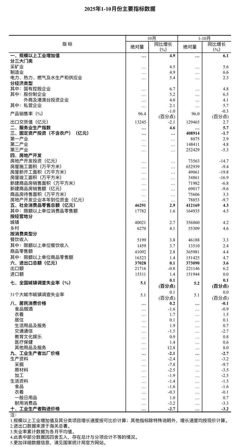 新京报讯 据国家统计局报道,10月份,在以习近平同志为首的党中央坚强领导下,各地区、各部门忠实落实党中央、国务院决策部署,坚持稳中求进大势,加大稳就业、稳企业、稳市场、稳预期力度,深化全国统一市场建设,积极推动国内国际双循环。生产供给基本稳定,就业总体稳定,物价好转,新的增长动力不断涌现,国民经济总体保持平稳、持续、进步的发展态势。一、工业生产持续增长,装备制造业和高技术制造业增长较好。总体上看,工业增加值高于全国指定规模比去年同月增长4.9%,比上月增长0.17%。分三类增加值看,采矿业增长4.5%,制造业增长4.9%,电力、热力、燃气及水生产和供应业增长5.4%。装备制造业增加值比上年增长8.0%,高技术制造业增加值增长7.2%,分别超过规模以上工业增加值3.1个和2.3个百分点。分经济类型看,国有企业增加值比上年增长6.7%。有限公司上涨5.2%。外资及港澳台商投资企业增长4.0%。民营企业增长2.1%。产品端,3D打印设备、新能源汽车、工业机器人产量增长分别比上年增长30.8%、19.3%和17.9%。 1-10月,全国规模以上工业增加值同比增长6.1%。 10月份,制造业采购经理人指数为49.0%,企业生产经营活动预期指数为52.8%。 1-9月份,规模以上国有工业企业实现利润总额53732亿元,比去年同期增长3.2%。二、服务业稳定增长,现代服务业发展顺利。 10月份全国服务业生产指数比去年同月增长4.6%。分行业看,信息和通信业、软件和信息技术服务业、商务和租赁服务业、金融业生产指数比上年分别增长13.0%、8.2%和5.6%分别高于上年服务业生产指数8.4%、3.6%和1.0个百分点。 1-10月家政服务业学生工业指数比去年同期增长5.7%。 1-9月,规模以上服务业企业营业利润同比增长7.6%。 10月份服务业商务活动指数为50.2%,服务业商务活动预期指数为56.1%。其中,铁路运输、航空运输、邮政、住宿、文化体育娱乐等行业蓬勃发展,商务活动率高达60.0%以上。三、市场销售规模扩大,服务零售增速加快。 10月份社会消费品零售总额46291亿元,同比增长2.9%。与之前相比月上涨0.16%。按经营单位所在地分,城镇消费品零售额40021亿元,比上年增长2.7%。全年社会消费品零售总额6270亿元,增长4.1%。按消费类型分,商品零售额4109.2亿元,增长2.8%。餐饮收入增长3.8%为5199亿元。基本生活品类和部分奢侈品品类消费快速增长。粮食、石油、食品、通讯器材、文化文具、限额以上体育休闲用品零售额比上年分别增长9.1%、23.2%、13.5%和10.1%。 1-10月,社会消费品零售总额412169亿元,比去年同期增长4.3%。国内网络零售额127916亿元,比上年增长9.6%。其中,实物商品网上零售额103984亿元,增长6.3%,占社会消费品零售总额的比重为25.2%。 1-10月服务业零售额同比增长5.3%,比前三季度提高0.1个百分点。其中,文化体育休闲服务、通信信息服务、旅游咨询和租赁服务、交通运输服务零售额快速增长。四、固定资产投资同比下降,但制造业投资继续增长。 1-10月,全国固定资产投资(不含农户)408914亿元,比上年下降1.7%。全国固定资产投资(不含房地产开发投资)增长1.7%。分行业看,基础设施投资比上年下降0.1%,制造业投资增长2.7%,房地产开发投资下降14.7%。全国新建商品住宅销售面积71982万平方米,比上年下降6.8%。新建商品住宅房屋销售额691.7万元,下降9.6%。不含房地产开发投资的民间投资增长4.8%。 0.2%。高技术产业中,信息服务业、航空航天及设备制造业、计算机及办公设备制造业投资同比分别增长32.7%、19.7%和4.1%。 10月份固定资产投资(不含农户)环比下降1.62%。五、货物进出口保持增长,商贸结构持续优化。 10月份货物进出口总额37028亿元,比去年同月增长0.1%。其中,出口额21716亿元,下降0.8%。 1-10月,货物进出口总额373.09亿元,比去年同期增长3.6%。其中,出口221146亿元,增长6.2%。进口151944亿元,与上年持平。 1-10月,一般贸易进出口增长2.3%,占进出口总额的63.4%。对共建“一带一路”国家进出口增长5.9%。私营企业进出口增长7.2%,占进出口总额的57.0%,比上年同期提高1.9个百分点。机电产品出口增长8.7%,占出口总额的60.7%。 6.就业情势は概ね率は1月から10月にかけて低业率の全国平均は5.2%となっている。据10月份全国城镇调查显示,失业率为5.1%,比上月下降0.1个百分点。调查的当地登记劳动力失业率为5.3%。农民工登记失业率为4.7%,其中农民工登记失业率为4.5%。 31个大城市调查城镇失业率为5.1%,比上月下降0.1个百分点。全国公司员工平均每周工作48.4小时。七、居民消费价格由降转升,工业生产价格降幅收窄。 10月份全国居民消费价格指数(CPI)同比上涨0.2%,上月为下降0.3%。分行业看,食品烟酒价格比上年下降1.6%。居住上涨0.1%,生活必需品及服务价格上涨1.9%,交通和通信价格下降1.5%,教育文化消费价格文化娱乐价格上涨0.9%,医疗保健价格上涨1.4%,其他商品和服务价格上涨12.8%。食品烟酒价格中,猪肉价格下降16.0%,鲜菜价格下降7.3%,鲜果价格下降2.0%,粮食价格下降0.7%。扣除食品和能源价格的核心CPI同比上涨1.2%,涨幅比上月扩大0.2个点。 1-10月全国居民消费价格比去年同期下降0.1%。 10月份全国工业生产者出厂价格比去年同月下降2.1%,降幅比上月收窄0.2个百分点,环比上涨0.1%。国内工业生产者购进价格比上年下降2.7%,降幅收窄0.4个百分点,比上月上涨0.1%。 1-10月工厂出货价格及全国工业生产者购进价格同比分别下降2.7%和3.2%