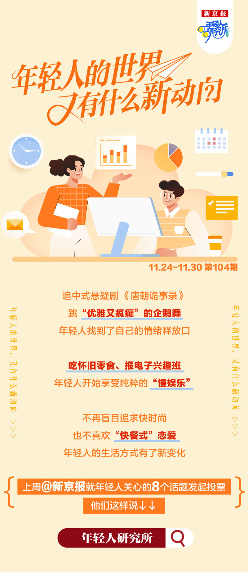 中国悬疑剧《唐朝奇葩说》结束后,年轻人跳起了“优雅又疯狂”的企鹅舞,找到了属于自己的情感释放。年轻人开始通过吃怀旧零食、参加电子兴趣班来享受纯粹的“慢娱乐”。他们不再一味追求快时尚,不再厌恶对“快餐”的热爱。年轻人的生活方式正在发生新的变化。上周@ShinjingJun针对年轻人感兴趣的八个话题发起了一项调查。他们是这么说的↓↓策划赵王编辑艾震张玉和李世宇设计评审:卢子雄、李丽君